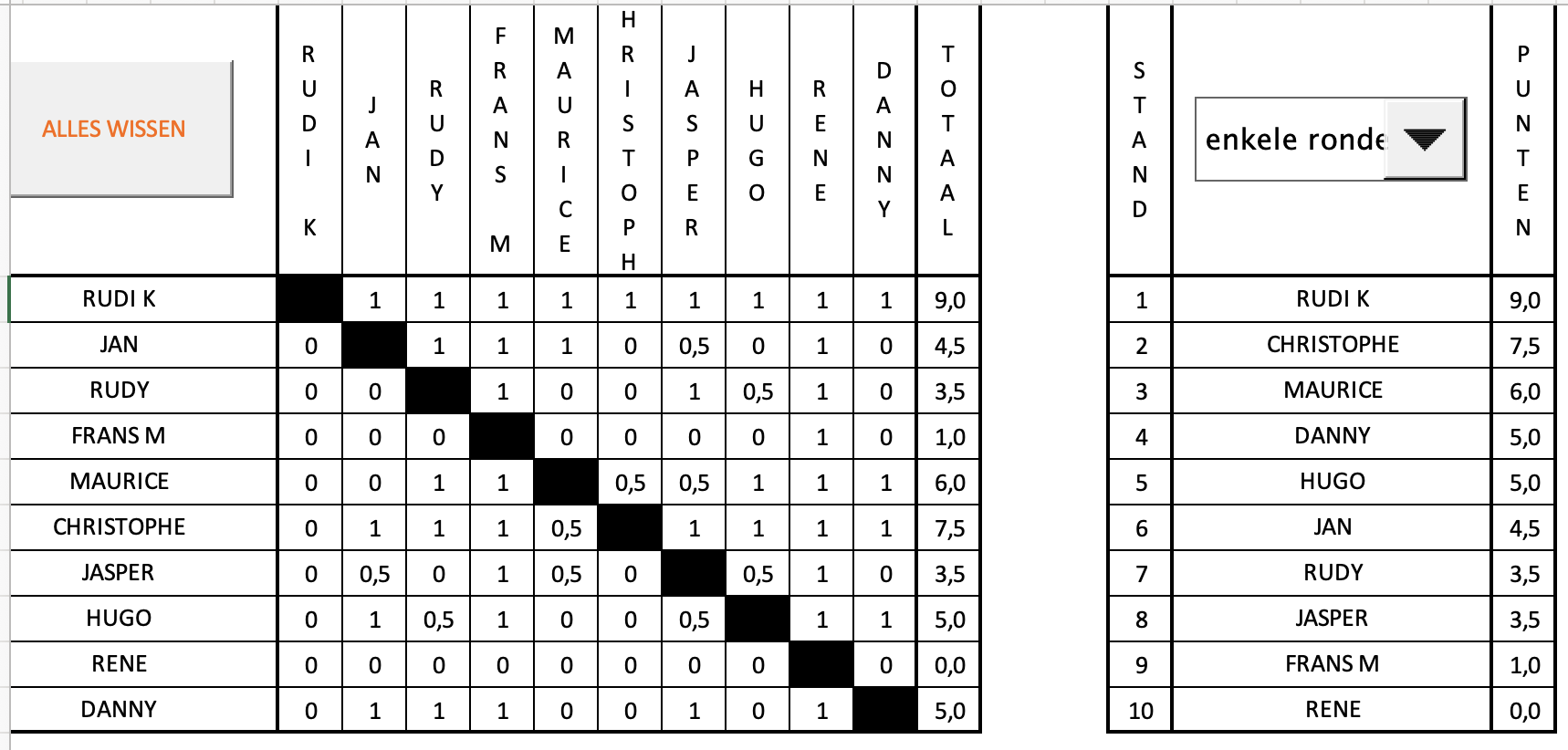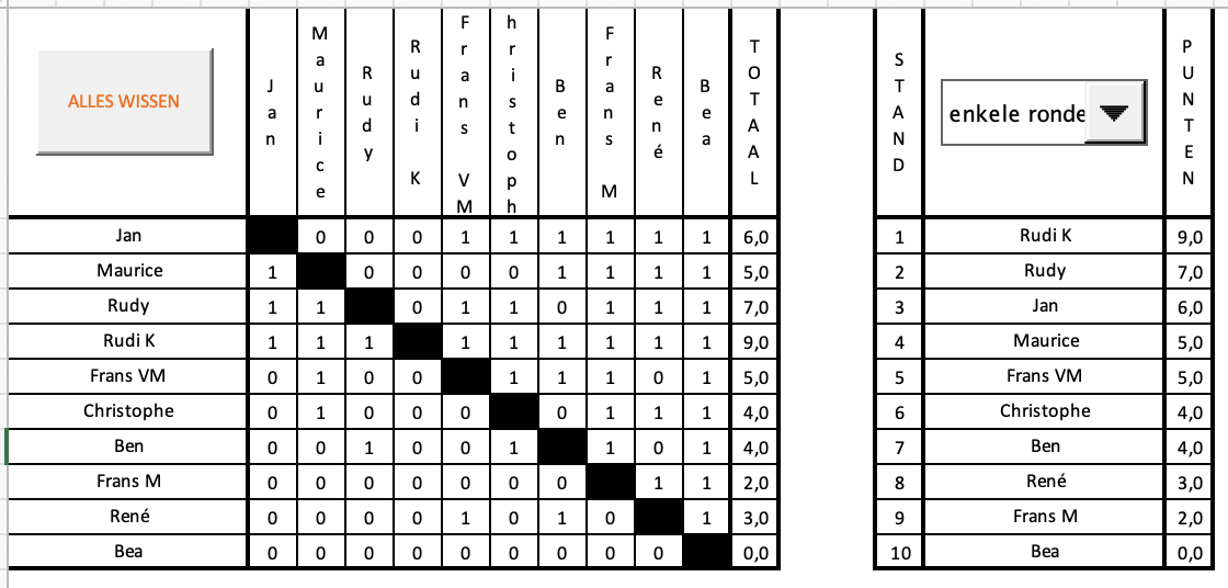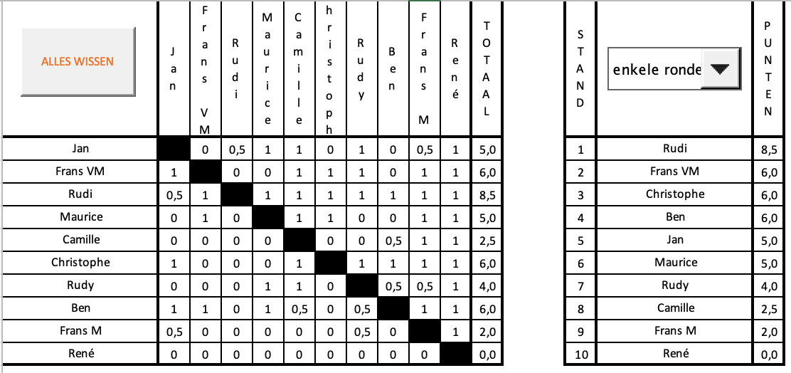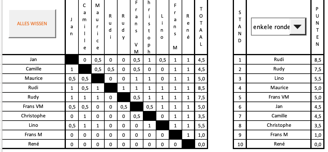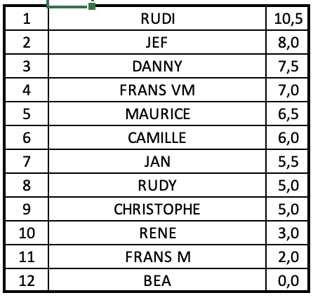 9 rondes bijgevolg en ook vandaag stond er weer geen maat op Rudi K (9/9). Het was lang wachten op de volgende... eindelijk kwam daar uit de bocht Christophe (5,5/9) die zijn longen leegreed om voor het trio Ben - Jan - Maurice te blijven, allen met 5/9, Op de voet gevolgd door Rudy met 4,5 en voor het duo Fransen (4/9) om uiteindelijk nog Danny met 3/9 voor René te zien eindigen.