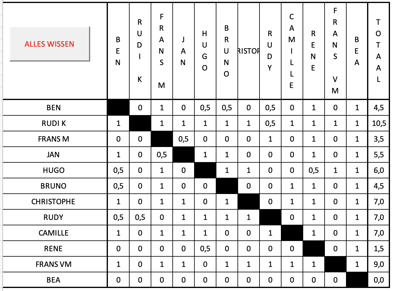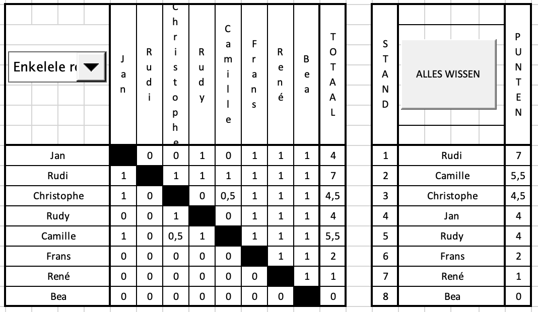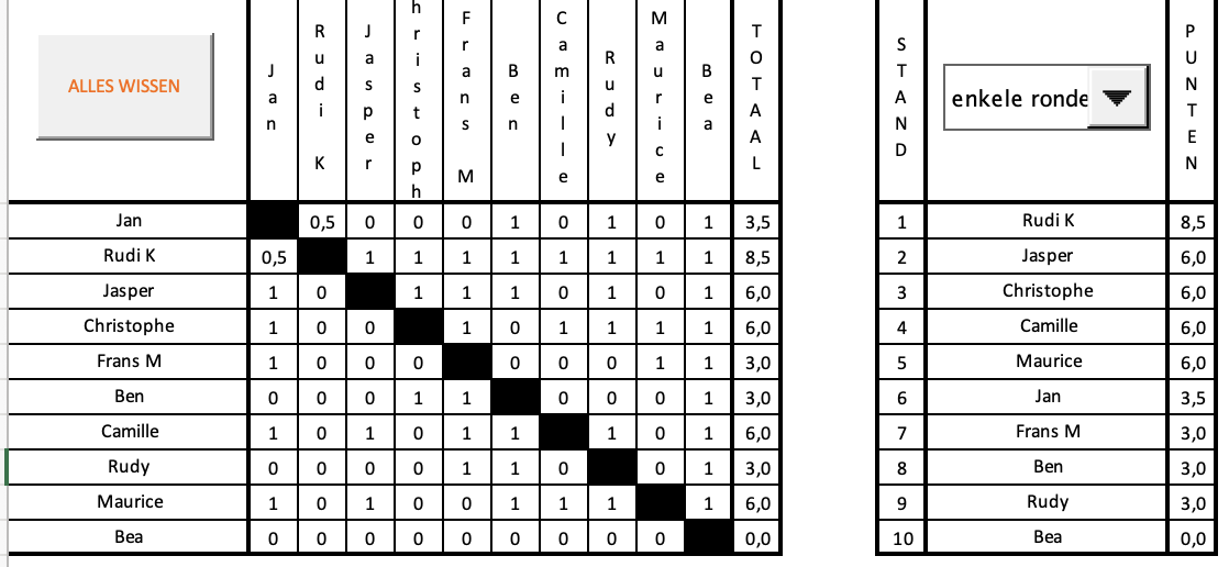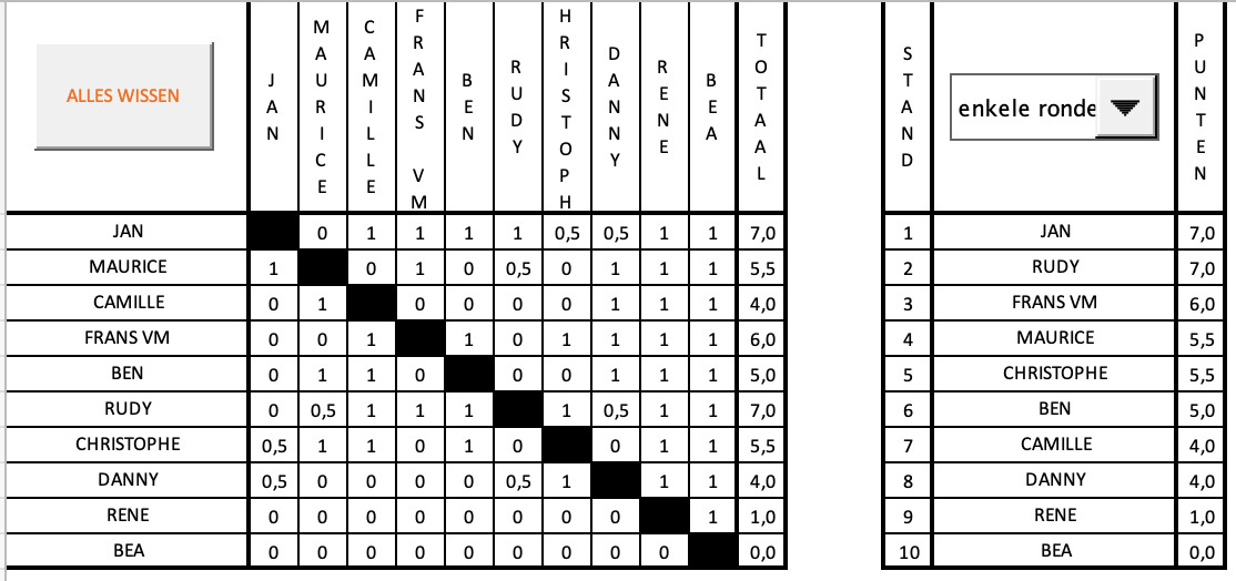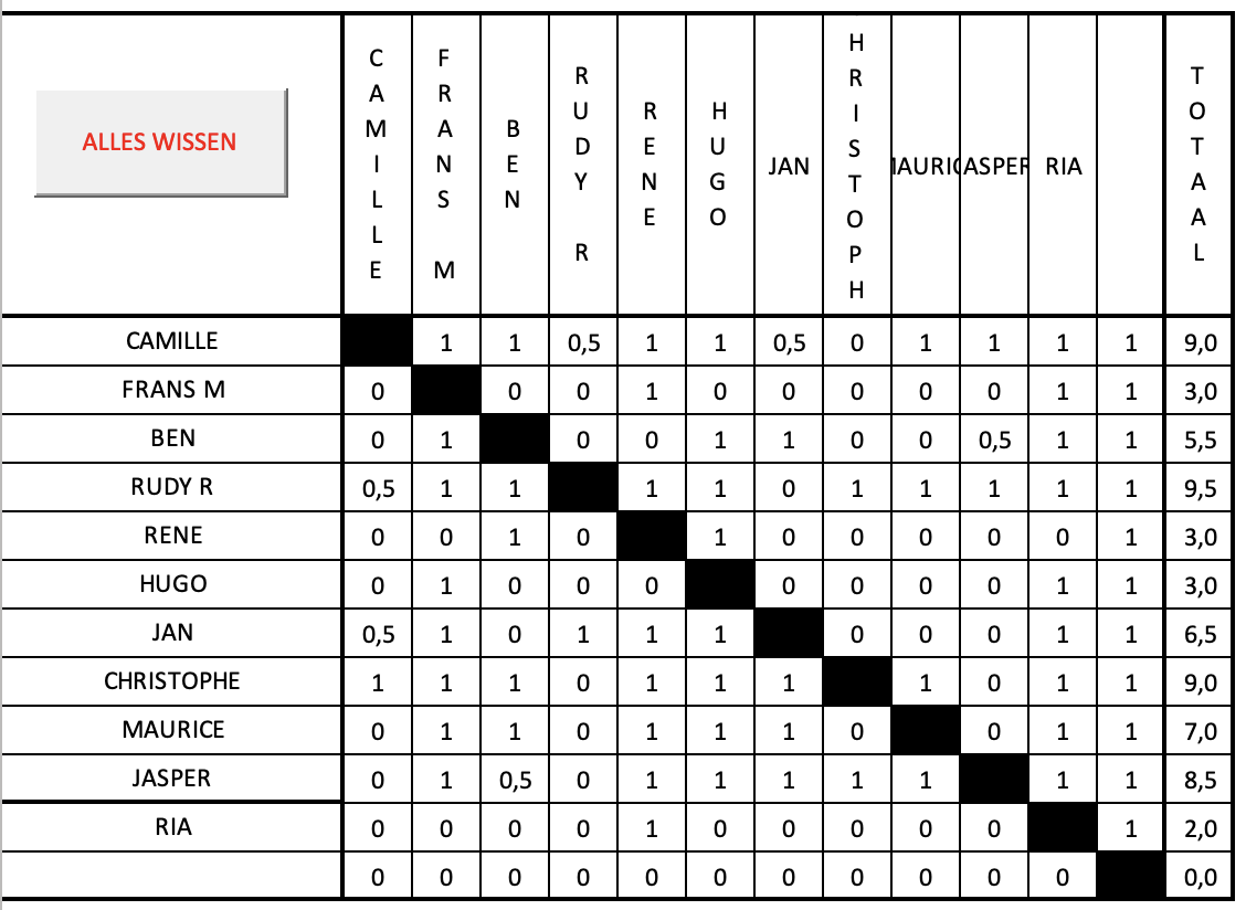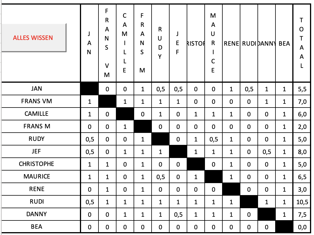 In extremis kwam Ben toe, voortgetrokken door Lola, omdat Lola te moe was om deel te nemen, moest Bea meedoen. Het was alleszins een zeer spannende strijd. Rudi begon al met een gelijkspel en Jasper verloor zodat iedereen wel kon winnen en verliezen. Dit resulteerde in een eerste plaats voor Rudi, die maar een half puntje moest laten liggen. Hierachter kwam er een hele meute voor het zilver : Jasper, Christophe, Camille en Maurice. (De doos met zilveren medailles moet nu wel bijna leeg zijn). Elk met 6 punten. Met een half puntje meer dan de rest haalde de schrijver (Jan) toch nog brons (weliswaar op de zesde plaats); al de anderen haalden 3 punten. Alleen Bea behield de rode lantaarn met 0 punten. Zo heeft iedereen toch wel wat kunnen winnen gisteren.