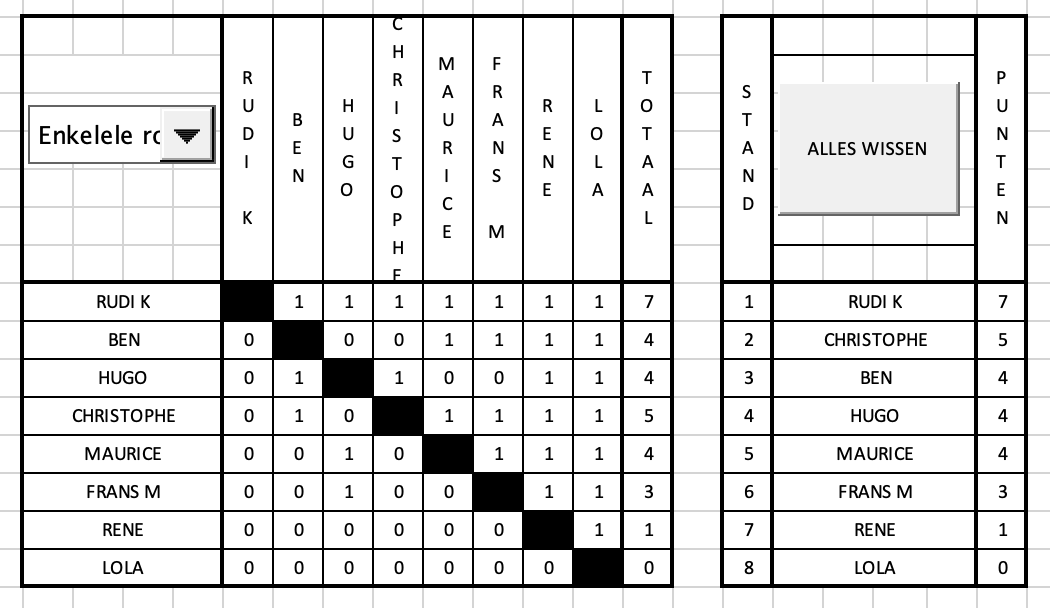 Aan de supprematie van Rudi K was weer niet te tornen, alhoewel Hugo er toch een goed gevoel bij had. Christophe eindigde op de 2de plaats en de derde plaats werd ingevuld door het trio (!) Ben, Hugo en Maurice met 4 punten uit 7. Frans M volgde op één schamel punt en René was nog net Lolo te vlug af. Onze lieve Lola eindigde de debatten zonder geblaf, maar ook zonder punten.