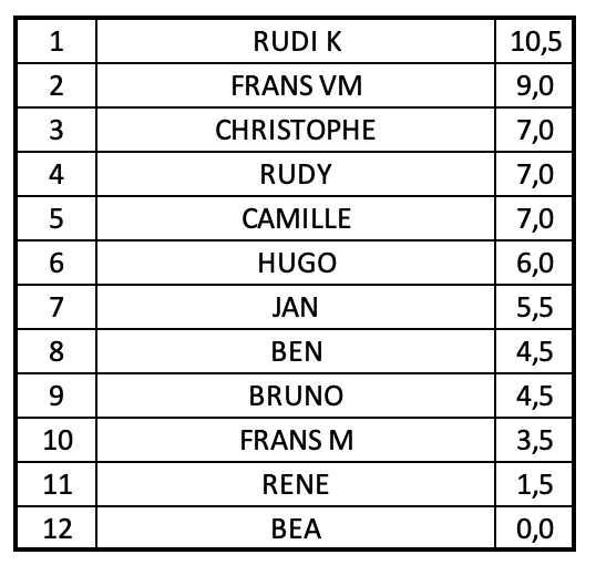 Rudi K liet zich eenmaal verrassen door Rudy, die een remise opeiste 10,5/11). Frans VM (9/11) wist de zilveren medaille mee naar huis te nemen en zal waarschijnlijk tijd genoeg hebben om hem op te poetsen wanneer hij voor de tunnel staat aan te schuiven. Een gedeelde bronzen medaille voor het trio Camille, Christophe en Rudy (7/11). Een met moment verrassende Hugo volgde nadien met 6 ptn op 11, op de voet gevolgd door Jan (5,5) en het duo Ben en Bruno (4,5). Daarachter volgden Frans M (3,5) en René (1,5) die enkel Bea nog achter zich liet.