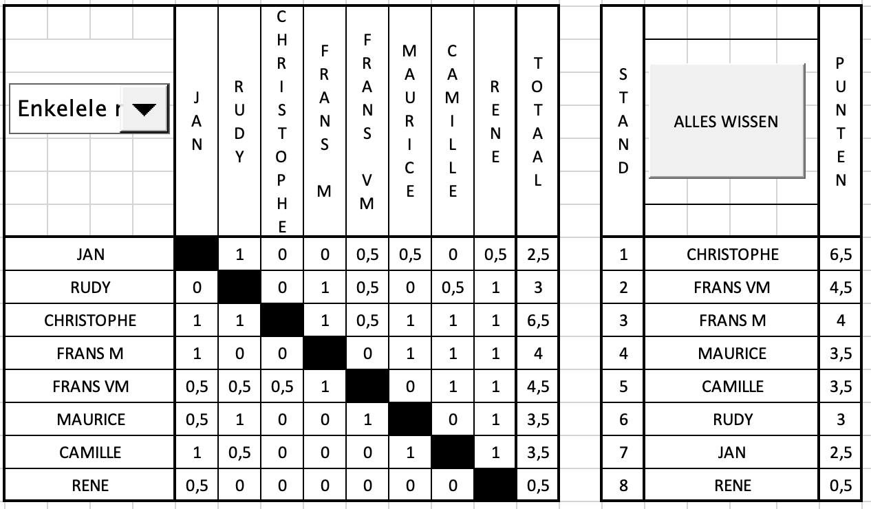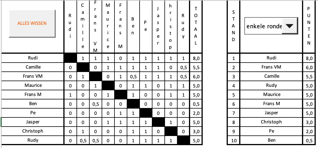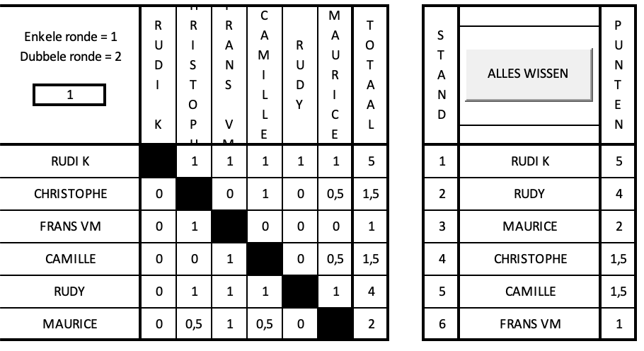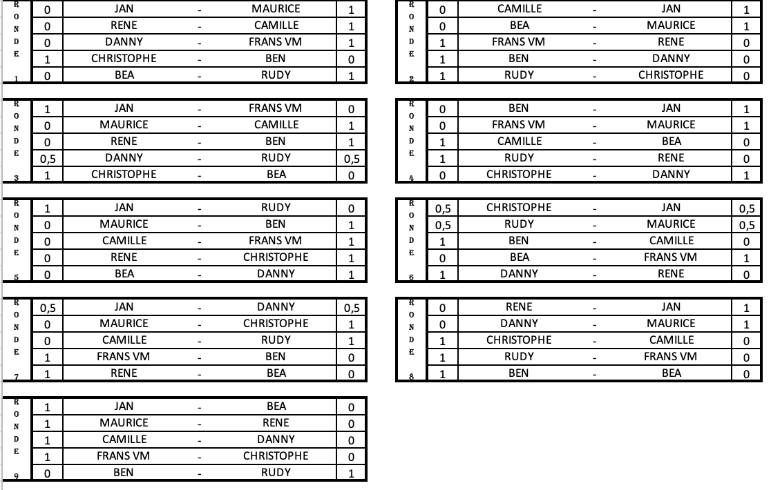 Aanvankelijk waren we met negen. Lola liet zich niet zien zodat Bea zich aan het opwarmen was. Rudy zag zich al verzekerd van een punt tegen Bea toen plots Bruno nog binnenkwam en Rudy dus toch nog moest strijden voor zijn punt.Rudi was weer in topvorm en liet geen enkel punt liggen.Rudy moest maar twee punten laten liggen: tegen Rudi en Maurice. hij eindigde dan ook tweede.Voor Christophe waren de zwarte beesten de beide Rudi(y)'s en Camille en Maurice hielden hem mee van de tweede plaats met telkens een half punt. Hij werd dan alzo derde.