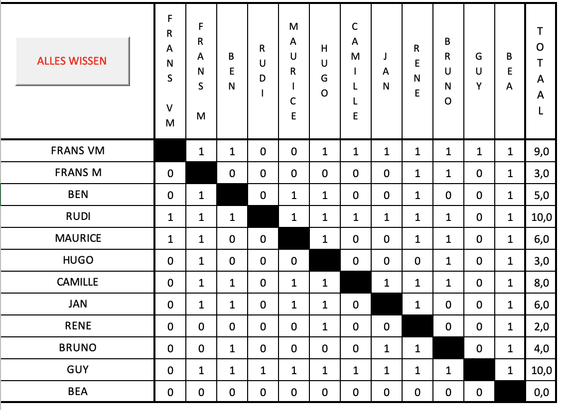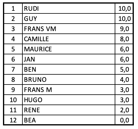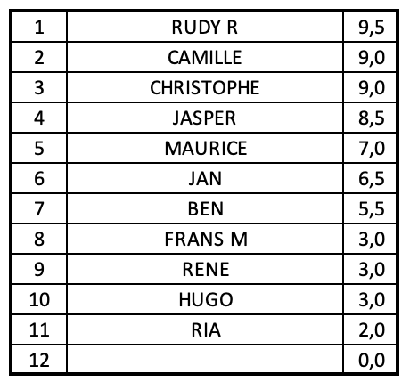 Geen Rudi K te bespeuren vandaag, dus greep Jasper zijn kans met 8,0 op 9 voor Rudy met 7,0 en Christophe 6,5. Vervolgens volgde het peloton met op kop Frans VM met 6,0 gevolgd door Ben met 5,0, Jan met 4,5 en Hugo 4,0. Frans M met 2,5, Ria met 1,5 en Bea, zoals gewoonlijk zonder punten maakten het klassement volledig!