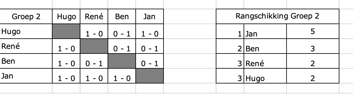 Groep B was het duo Ben en Frans met 4/5 te sterk voor de anderen. Jan met 3,5 volgde op een banddikte, gevolgd door Hugo met 2, René met 1,5 en tenslotte Bea.